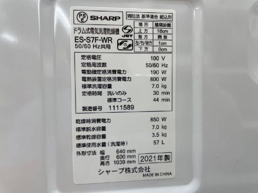 SHARP ドラム式洗濯乾燥機 ES-S7F