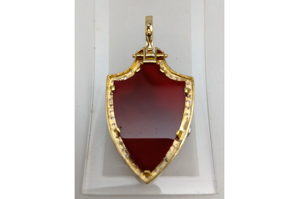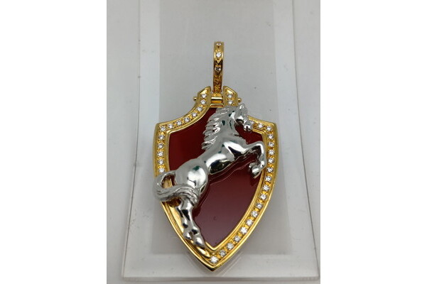 馬の部分がPt900、フチの部分がK18、フチにはメレダイヤ、赤い部分はメノウになります!
