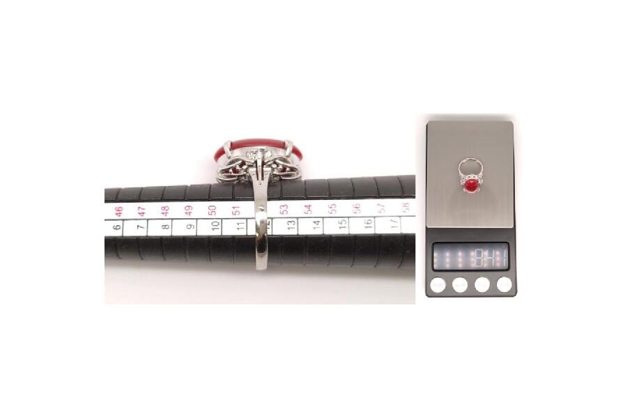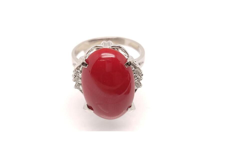 その輝きが赤珊瑚の色をより一層引き立て、リング全体のバランスを保っています