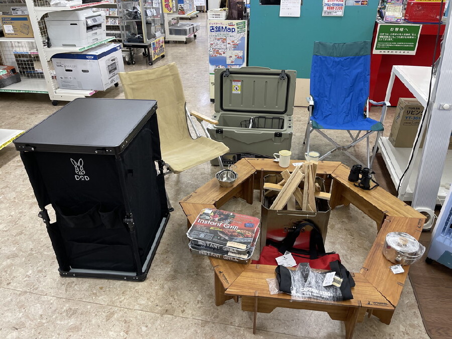 当店2F売り場ではキャンプに必要なクーラーボックス、チェア、テーブル、焚き火台テーブル