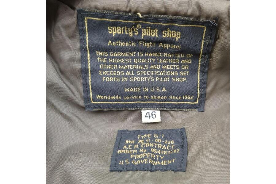 それは、Sporty’s Pilot Shopからリリースされた、型番954383282のゴートスキン製フライトジャケット、ダークブラウンのSIZE 46、80年代USA製のヴィンテージG-1です。