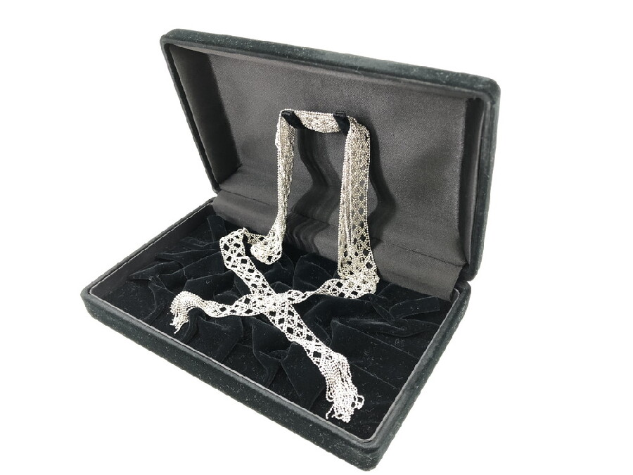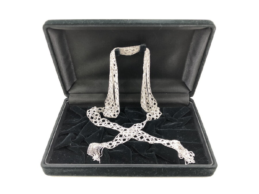 今回は、46.4gの重さと100cmの長さを持つ、幅1cmのK18リボン型ネックレスの
