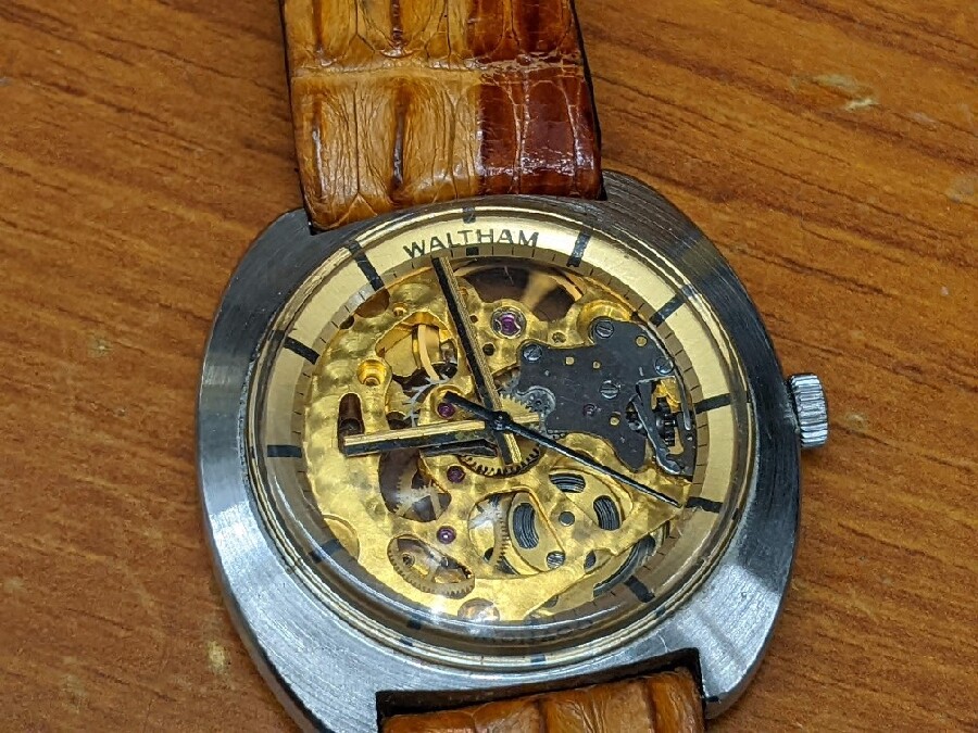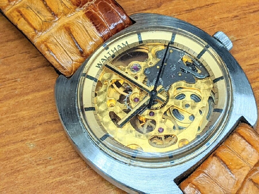 今回はスケルトンの見た目も素敵なアンティークウォッチ『ウォルサム モナコ』を買取させていただきました。