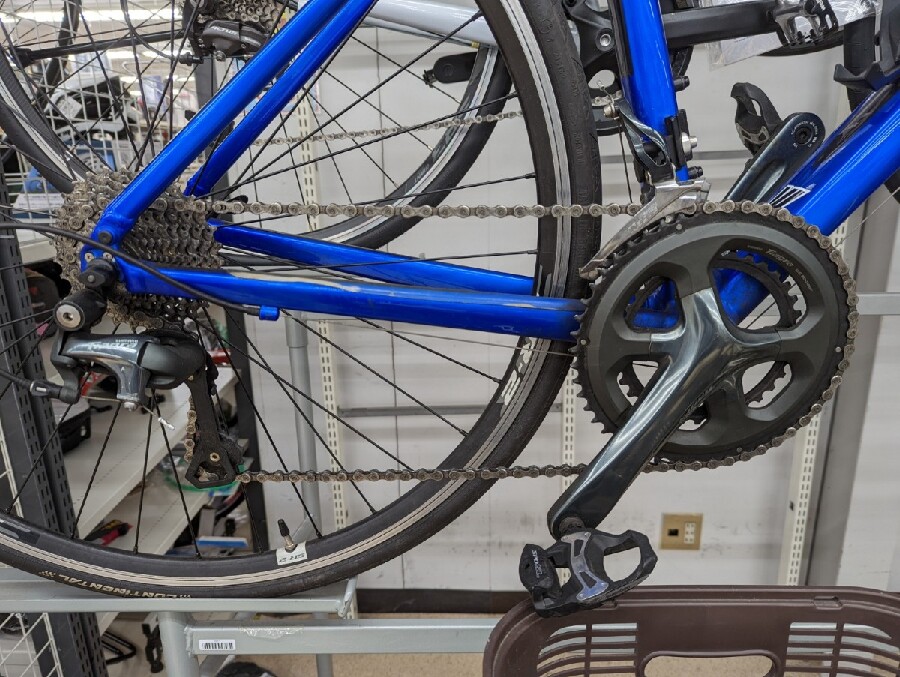 コンポーネントは10速のティアグラ。本格的なレース用ロードとしてはややもの足りませんが、チェーンも太くトラブルの少ないモデルです。