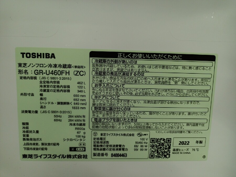 東芝 ノンフロン冷凍冷蔵庫 GR-U460FH 2022年製 入荷しました。