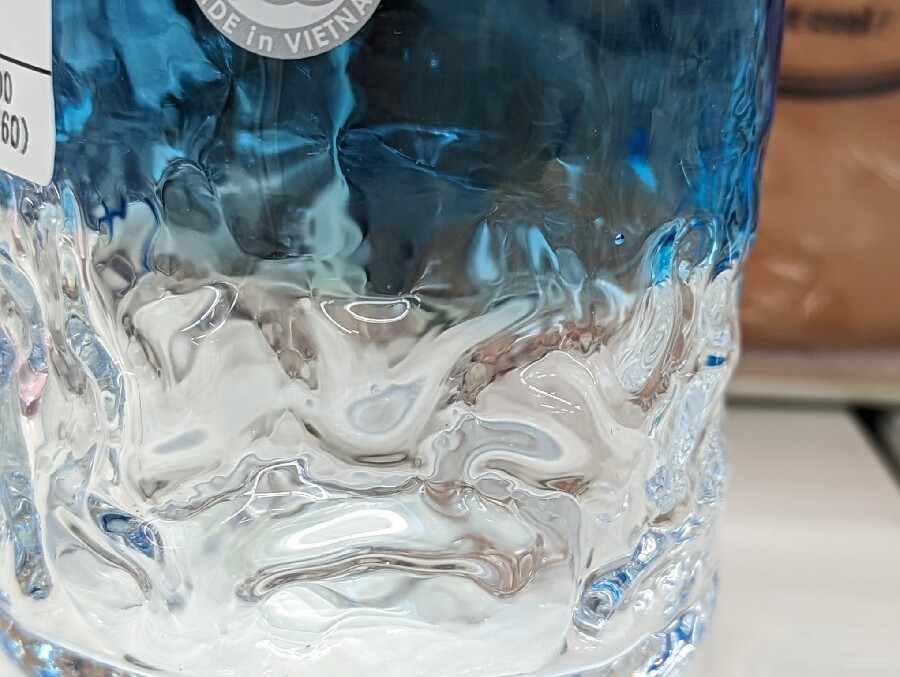 美しい青色と透明のグラデーション、表面の凹凸模様もあり、沖縄の美しい海を連想させる素敵なグラスです。