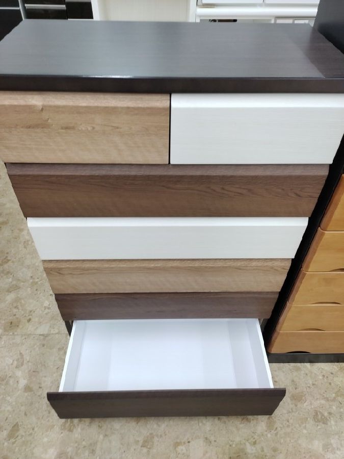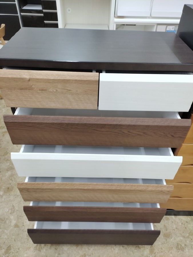 シンプルなデザインが多いチェストですがこちらのお品物は引き出しごと色合いが