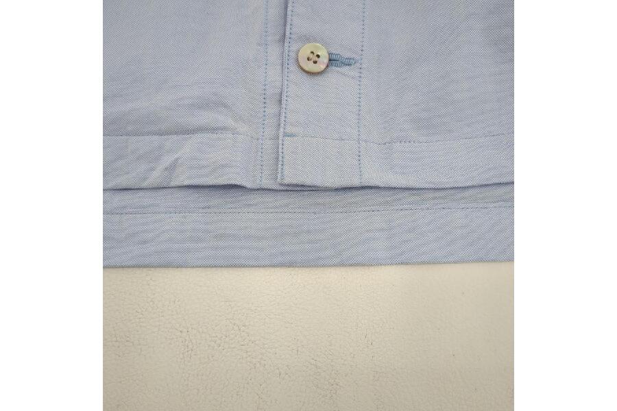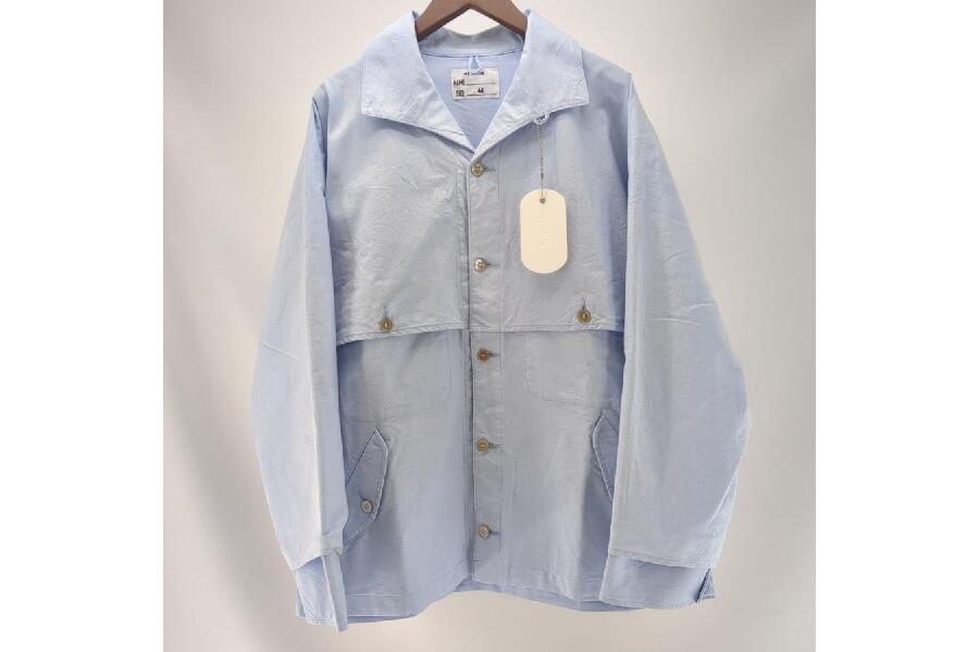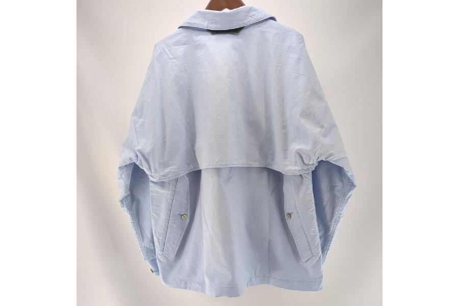 このジャケットは、スカイブルーの鮮やかな色味が魅力で、シンプルながらも洗練されたデザインが特徴です。サイズはSIZE_44_SMALLとなっており、スリムなシルエットで着こなしが決まる一着です。また、各部の寸法も正確に表示されており、購入前のサイズ確認にも最適です。