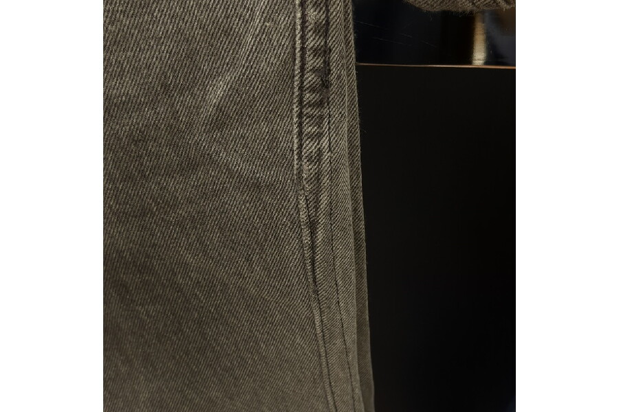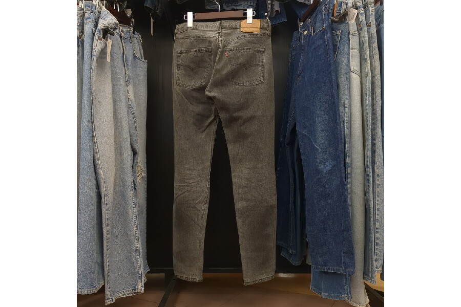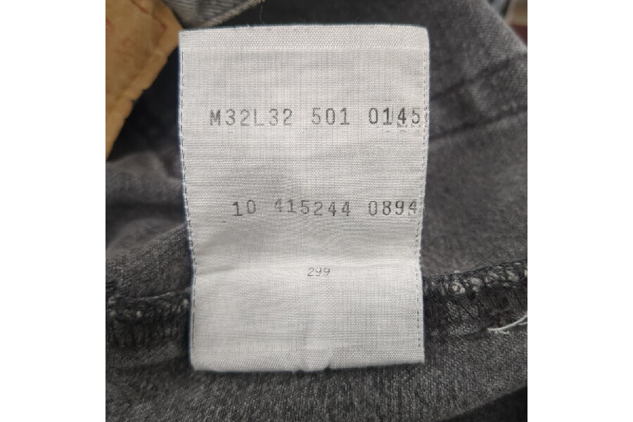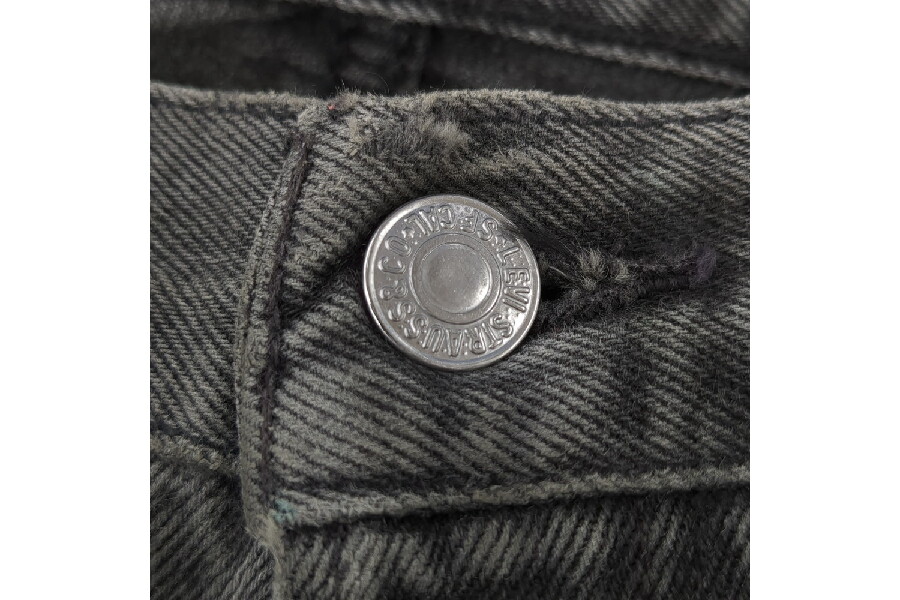強めにフェードしたブラック、こちらは裾にかけてテーパードのリメイク加工が施されたボタン裏刻印299の94年8月製造の英国製"ユーロリーバイス"。