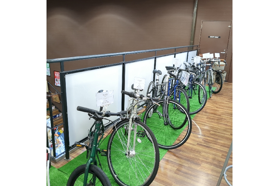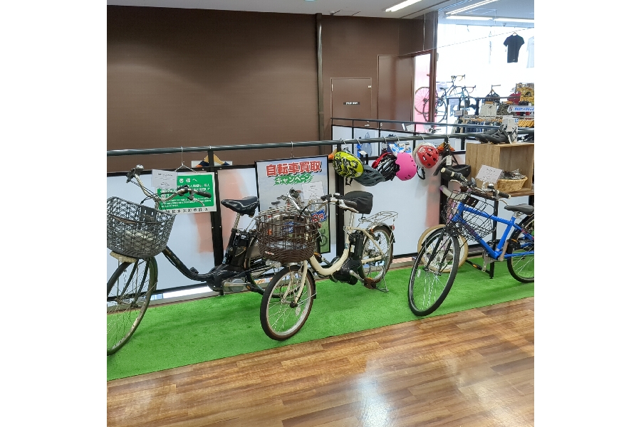 電動自転車、クロスバイク、ロードバイクは2階に上がって直ぐ左手、レジ前にございます!