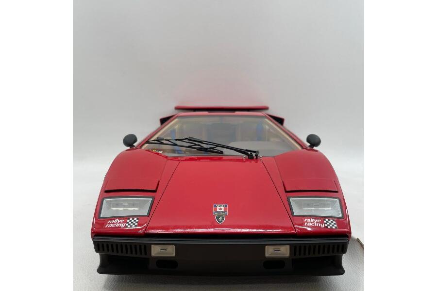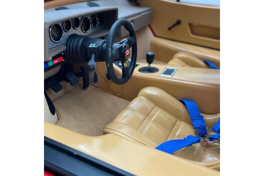 このモデルは、伝説の「ウォルター・ウルフ」仕様のカウンタック LP500Sを忠実に再現しています。1/8スケール(全長約50cm)という特大サイズだからこそ可能となった、細部の造形美が最大の特徴です。