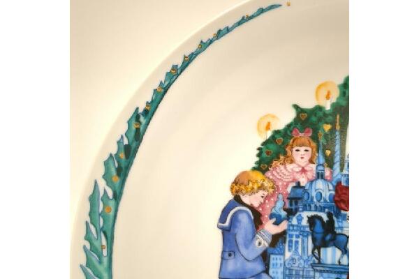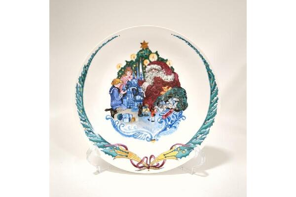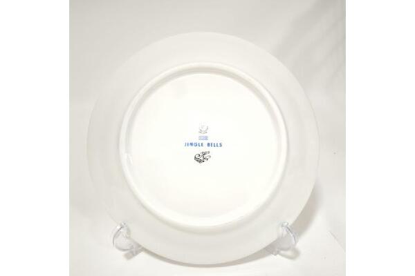 物語性のあるデザイン: プレート中央には象徴的なベルと柊、そして楽しげなクリスマスの風景が描かれています。イヤープレートよりも装飾的で、華やかな雰囲気が特徴です。