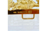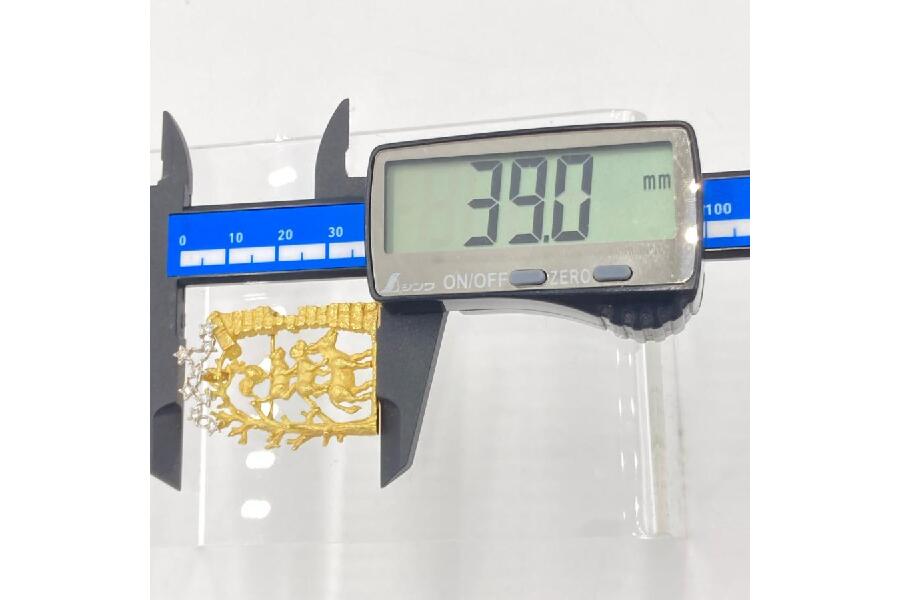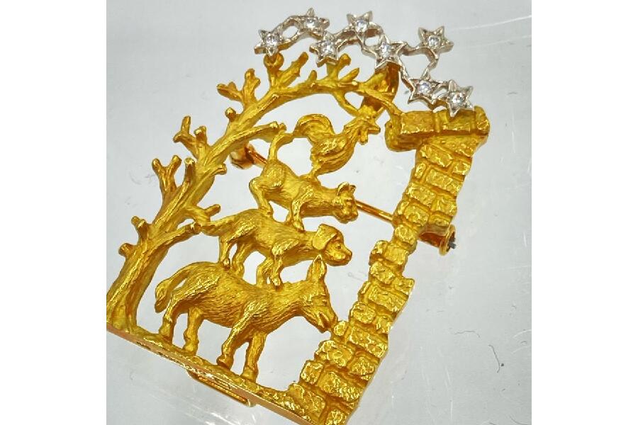グリム童話の一篇である、ブレーメンの音楽隊をモチーフにしたジュエリーとなっています。ロバ・イヌ・ネコ・ニワトリが積み重なり泥棒の家を見上げる有名なワンシーンを表現しています。空に輝く星をメレダイヤで表し、左側の樹木と、右側にレンガ造りの家が大変に緻密な技法で作り込まれています。