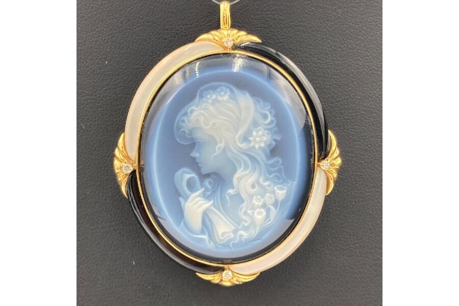 ストーンカメオ・・・メノウ、オニキスなどの天然石 ・シェルカメオよりも硬く、耐久 性があり宝石としても扱われ 多層の石を活かした彫刻が徴。