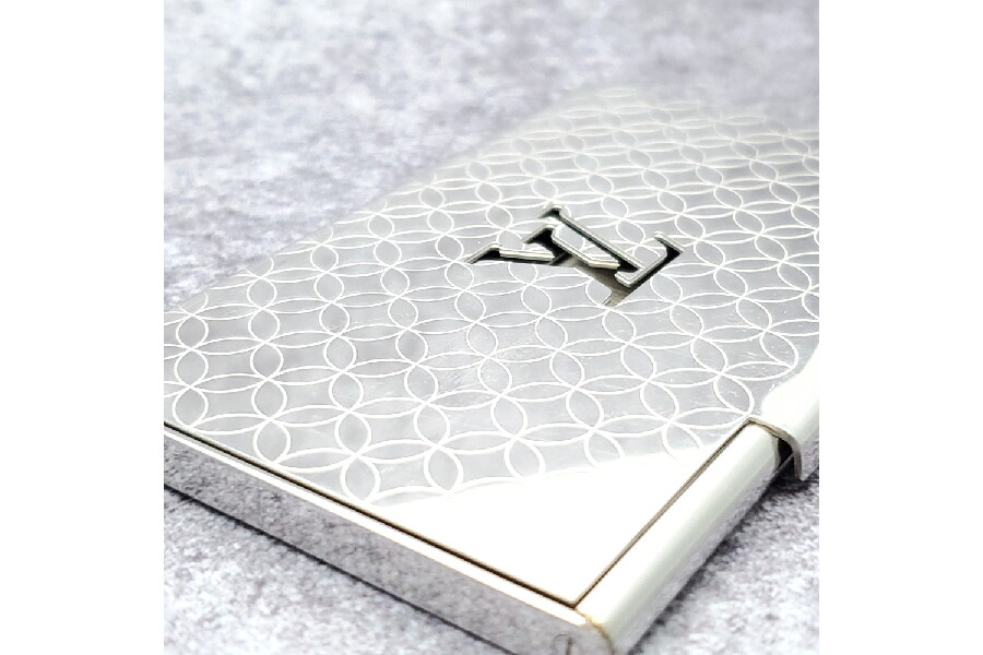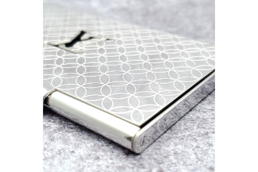 パラジウム仕上げのメタルベースに飾り穴であしらわれたLVロゴと、レーザーで刻印されたモノグラム・フラワーのモチーフが素敵です。