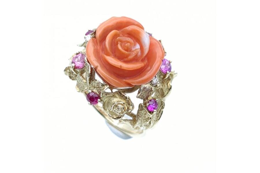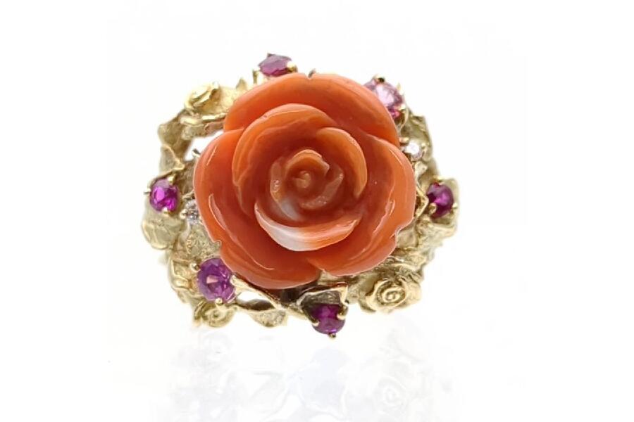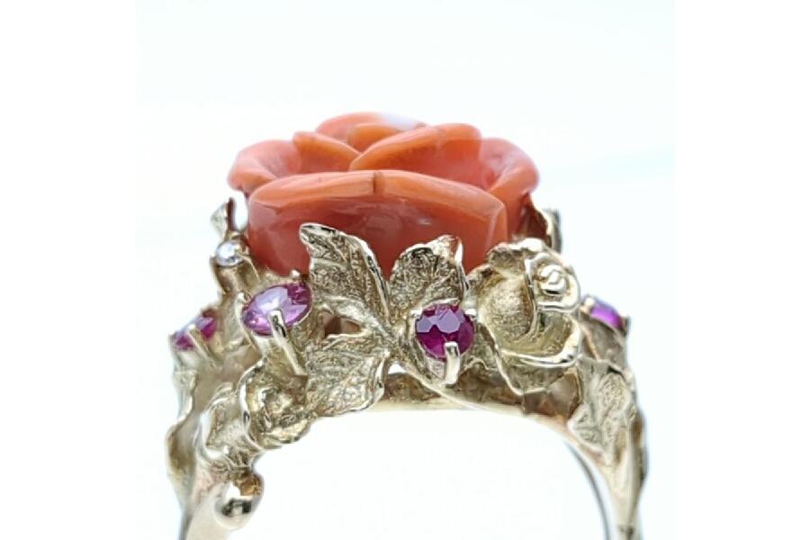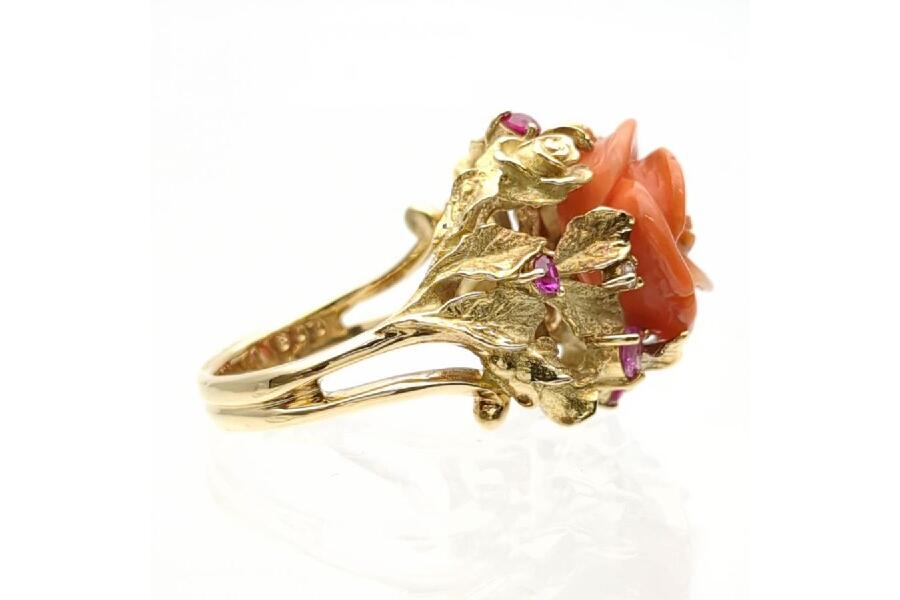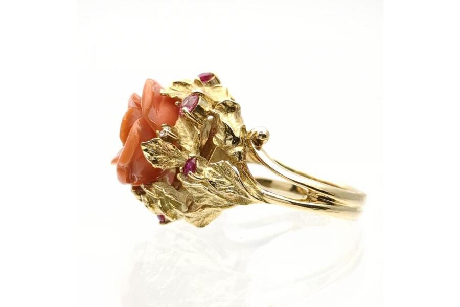 このリングは、品位がK18で、珊瑚、ダイヤモンド0.03ct、そしてルビーがセットされた、まさに贅沢な一品です。