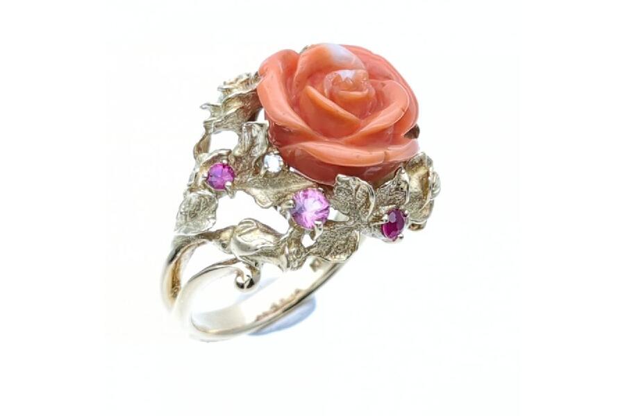 このリングには、海の宝石とも称される珊瑚が使われています。