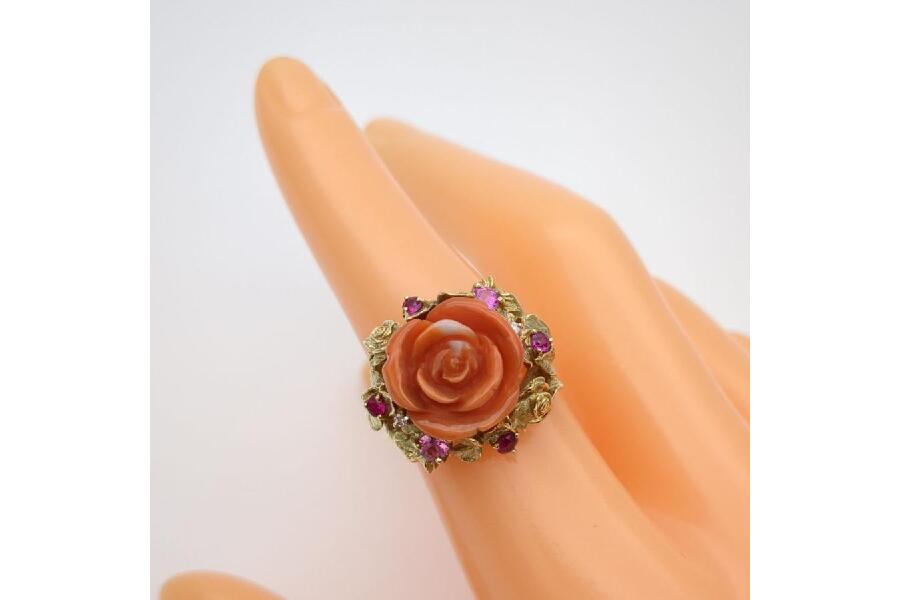 リング 13号 珊瑚 K18 10.5g ルビー ダイヤ バラ ローズ サンゴ コーラル Coral 18金 磨き済 中古 入荷しました♪