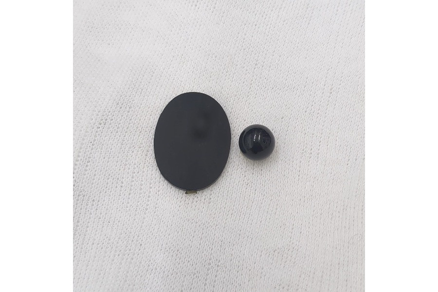 ②石の表面が均一な黒色で光沢が強いものがオニキス、よく見ると柱状の結晶や細かいひびが入っているものがブラックトルマリンです。