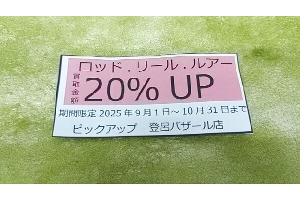 また、現在ピックアップ登呂バザール店限定で釣具ご購入時、9月からご利用になれるロッド、リール、ルアー買取20%UPクーポン券を配布中です。是非当店をご利用ください!