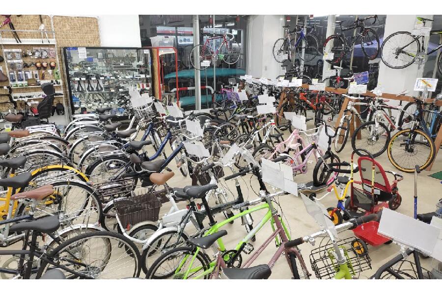 当店ではロードバイク、マウンテンバイクを筆頭にクロスバイクやミニベロ、シティサイクル、折り畳み自転車、電動アシスト付き自転車など100台以上の自転車を展示中です。