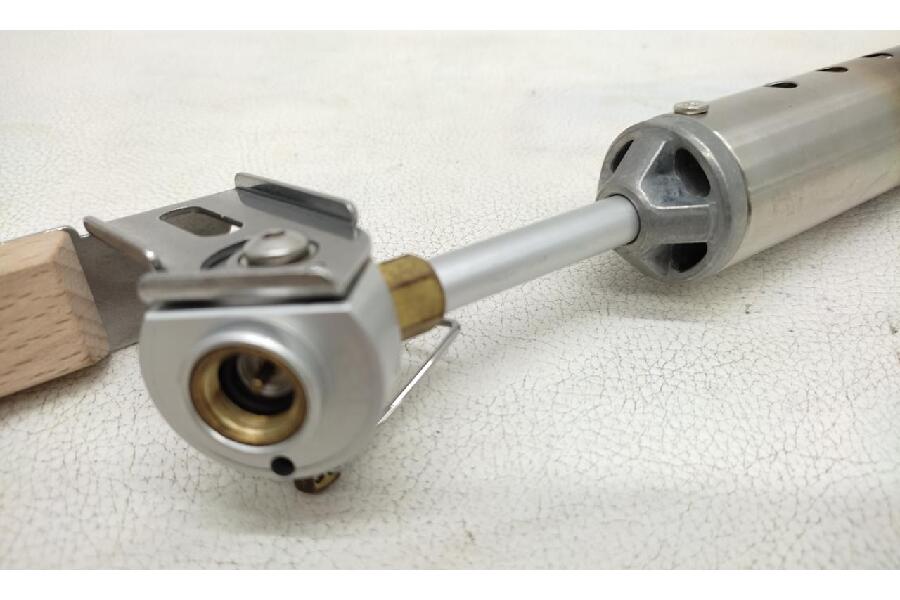 折りたたんでコンパクトに収納可能な、木製グリップが付いたトーチ