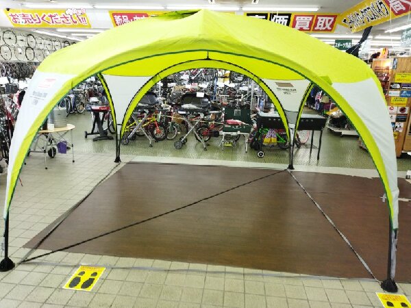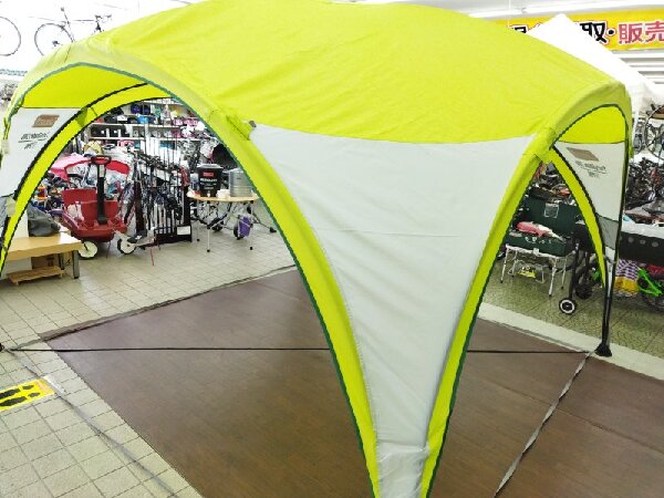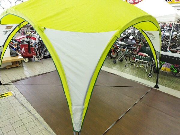 ワンタッチタープとはまた違った雰囲気をもつタープです。シェードの色がライムグリーンで明るい感じがあります。
